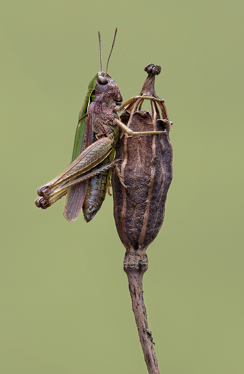 Green Grasshopper on Poppy Seedhead