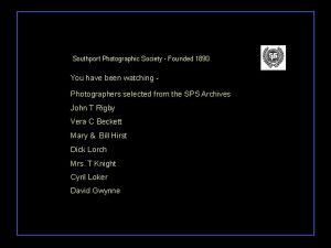Before we go on, the Society must thank Tony Thompson for doing the bulk of the work in keeping this archive together. His time and efforts are truly appreciated. He did have several assistants, who will be acknowledged as we go along. Thank you all.